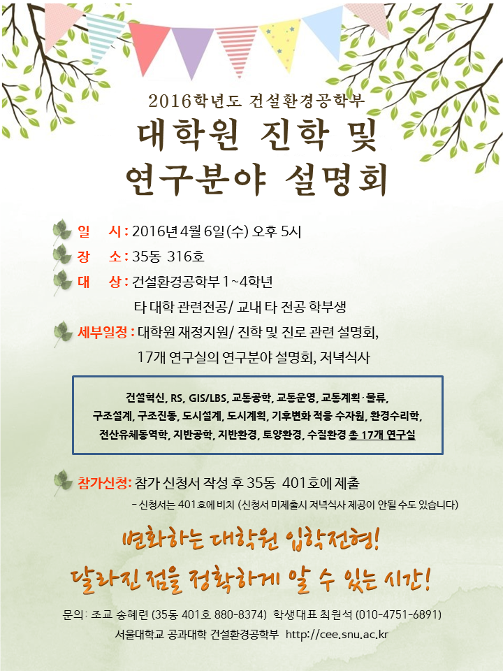 2016학년도 건설환경공학부 대학원 진학 및 연구 분야 설명회 안내 : 4/6(수) 17:00 316호