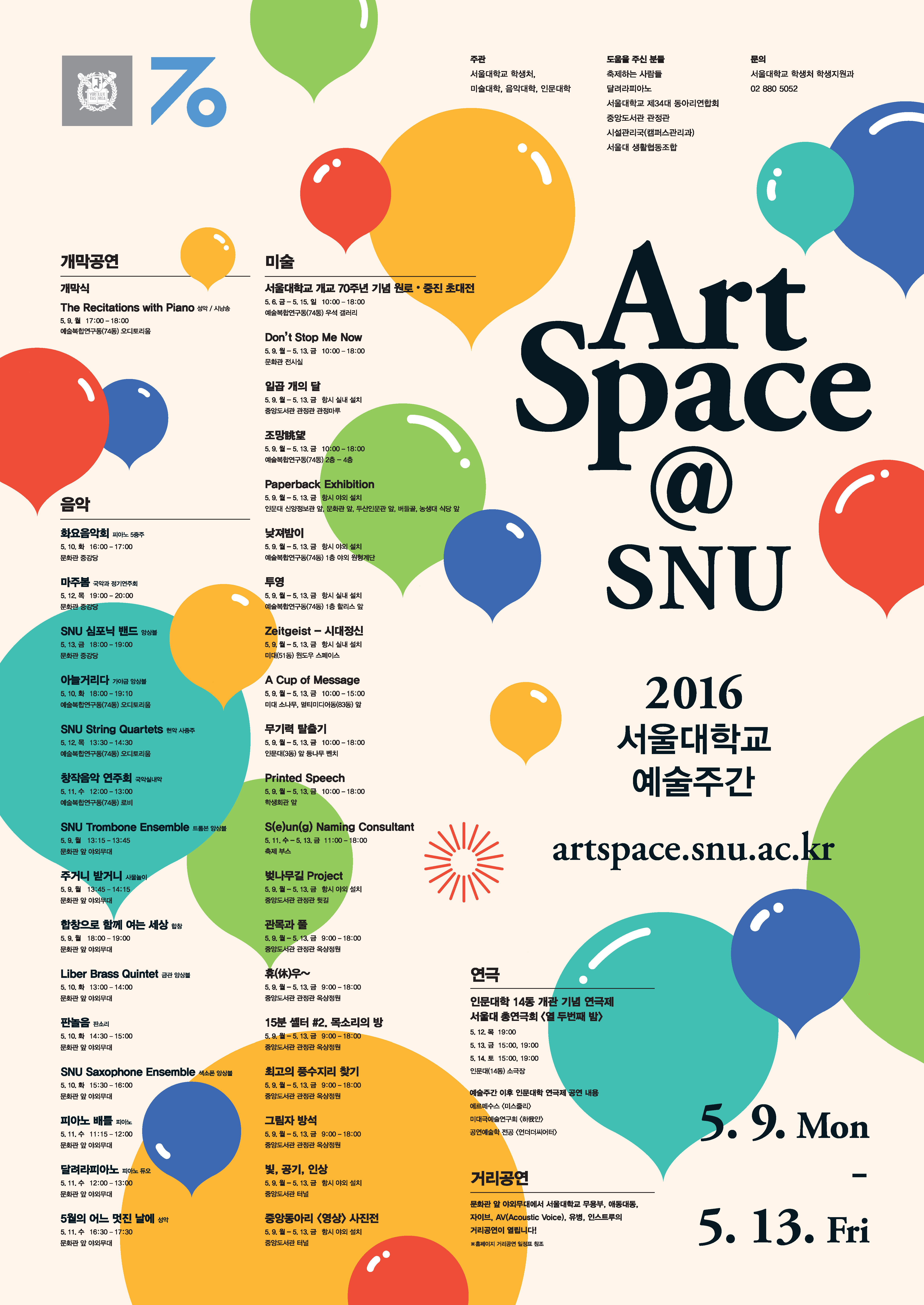 개교 70주년을 맞이하여 음악, 미술 등 예술이 살아 숨쉬는 예술문화캠퍼스 환경을 조성하고, 문화예술활동 활성화를 통한 학생들의 감수성 및 창의력을 제고하기 위해 「2016 예술주간; Art Space@SNU」 행사를 다음과 같이 개최하오니 관심있는 학생들의 참여를 바랍니다. 가. 기 간 : 2016. 5. 9.(월) ∼ 5. 13.(금) 나. 장 소 1) 실내: 문화관 중강당, 예술복합연구동, 관정관 등 2) 실외: 문화관 앞, 인문대 신양학술정보관 앞, 관정관 옥상정원 등 다. 행사내용 1) 음악: 피아노 듀오, 앙상블, 오케스트라, 합창, 판소리, 사물놀이 등 2) 미술: 회화, 공예, 사진 전시, 설치미술, 관객 참여미술 등 3) 학생(동아리) 참여 거리공연: 노래, 무용 등 4) 개막공연: 「The Recitations with Piano」(5개 언어권 성악 및 시낭송) ※ 개막식: 2016. 5. 9.(월) 17:00~18:00, 예술복합연구동(74동) 오디토리엄
