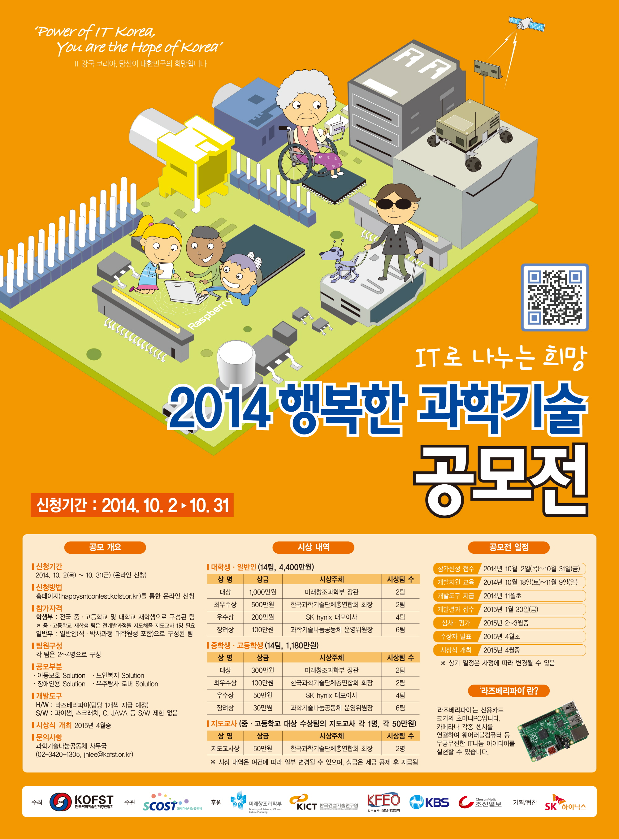 한국과학기술단체총연합회에서 창의적 IT분야 인재 양성과 사회적 약자를 배려하는 아이디어 발굴을 위한 ‘2014 행복한 과학기술 공모전을 아래와 같이 개최하는 바, 관심있는 학부생들의 참여 바랍니다.