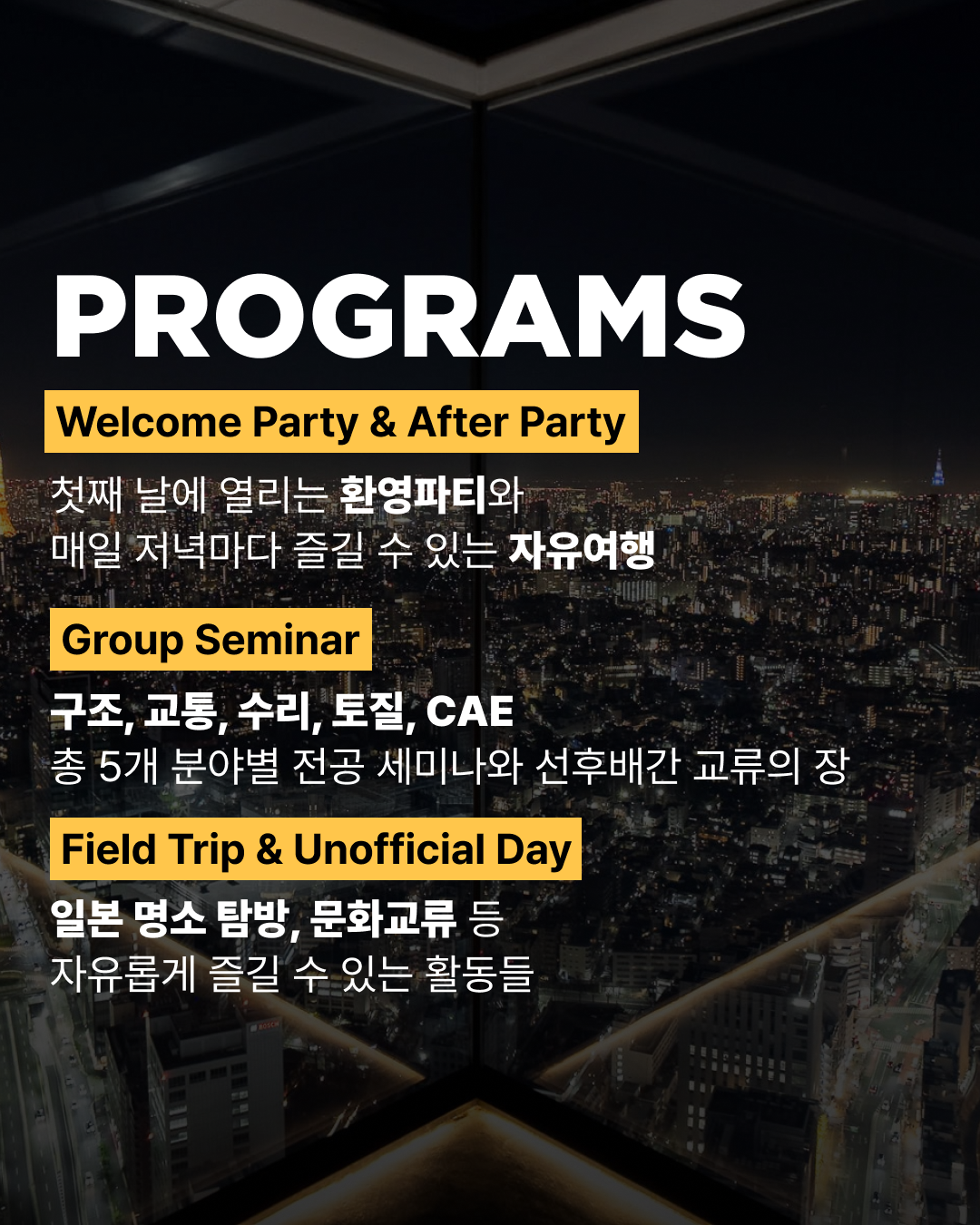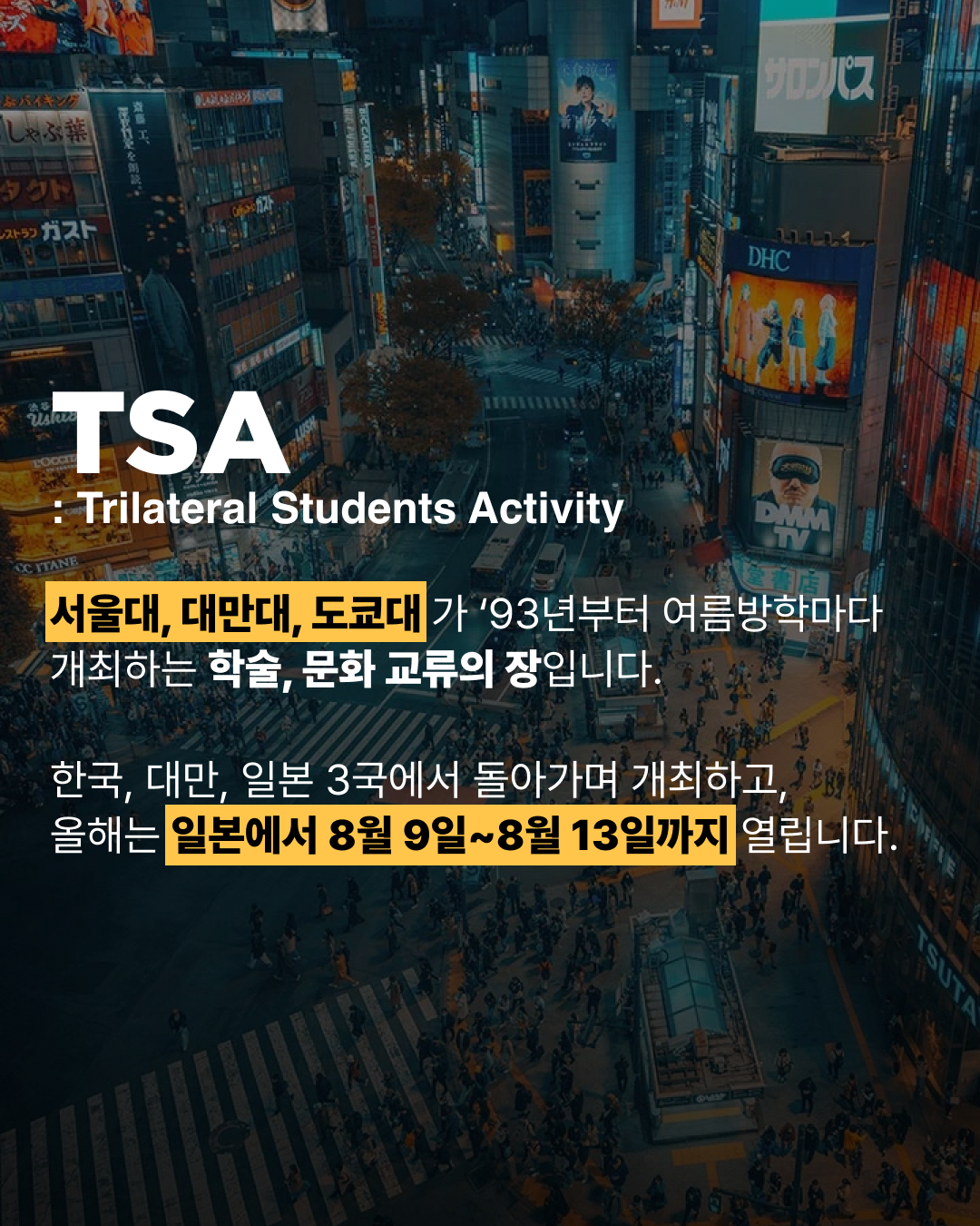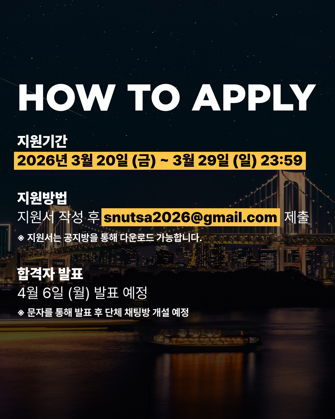 2026년 도쿄대에서 열리는 TSA 참여자를 모집합니다. 많은 신청 바랍니다. 지원기간: 2026년 3월 20일(금) ~ 3월 29일(일) 23:59 지원방법: 첨부된 지원서 작성 후 snutsa2026@gmail.com 으로 제출