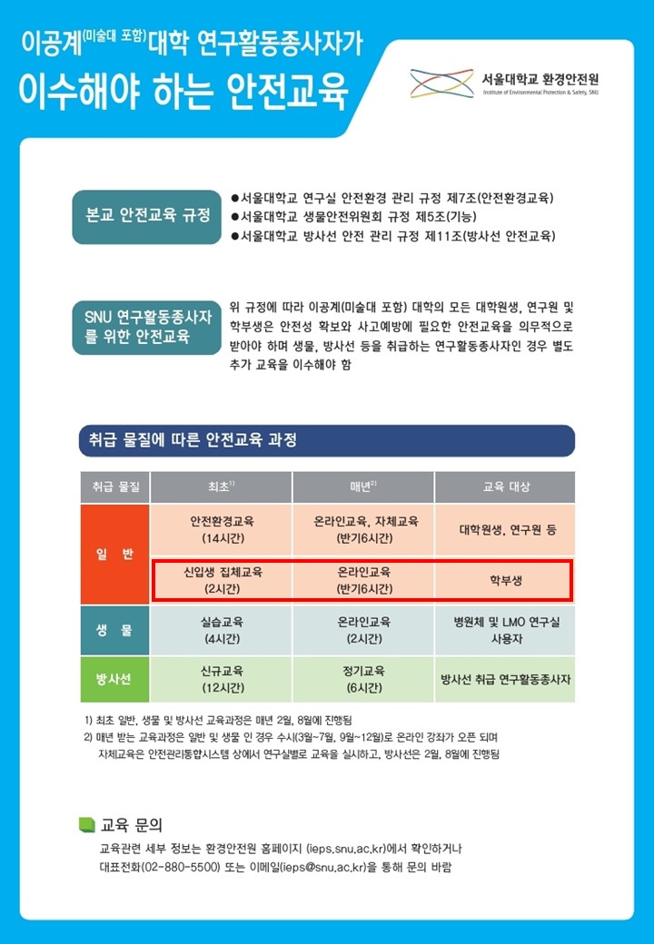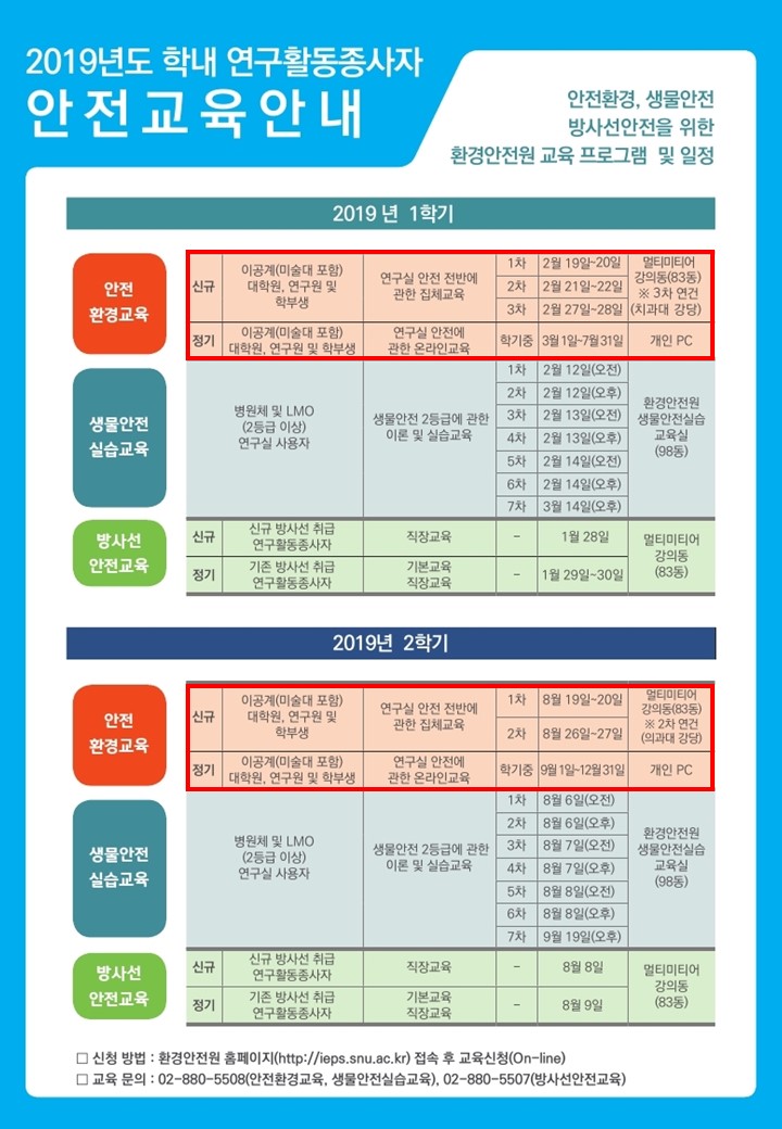 2019년도 안전환경교육 과정 일정 안내 이공계 대학 학부생은 연구실 안전성 확보와 사고예방에 필요한 안전환경교육을 의무적으로 이수하도록 하고 있습니다. 입학 당시 신규교육을 받아야 하며, 연구실(실험, 실습실 등) 출입시 정기교육이 필요합니다. 실험,실습생(연구실 출입자 등)들은 안전환경 정기교육(온라인 교육)을 이수하여 연구실안전 확보해주시기 바랍니다. 안전환경 정기교육(온라인 교육)은 http://rsis.snu.ac.kr 의 공지사항을 확인하고 이수하여 주시기 바랍니다.