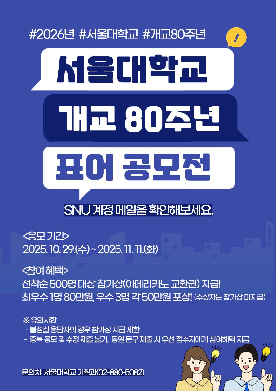 2026년 서울대학교 개교 80주년을 맞이하여 기념 표어 공모를 실시하니, 구성원 여러분께서는 개교 80주년에 대해 관심을 가져주시고 기념 표어 공모전에 참여해 주시기 바랍니다. 가. 공모전 개요 ❍ 공모내용: 개교 80주년 기념 표어 ❍ 접수기간: 2025. 10. 29.(수) ~ 2025. 11. 11.(화) ❍ 응모대상: 서울대학교 전 구성원 ❍ 참여방법: SNU 계정 메일로 발송된 설문 응답 및 제출 ❍ 참여혜택 - 참가상: 선착순 500명 스타벅스 음료(아메리카노) 쿠폰 지급 - 최우수 1명 80만원, 우수 3명 각 50만원 포상 ※ 최우수, 우수 수상자에게는 참가상 미지급 ❍ 심사방법 및 일정: 검토 및 심사(11월~12월)→시상 및 참가상 지급(12월~'26년 1월)