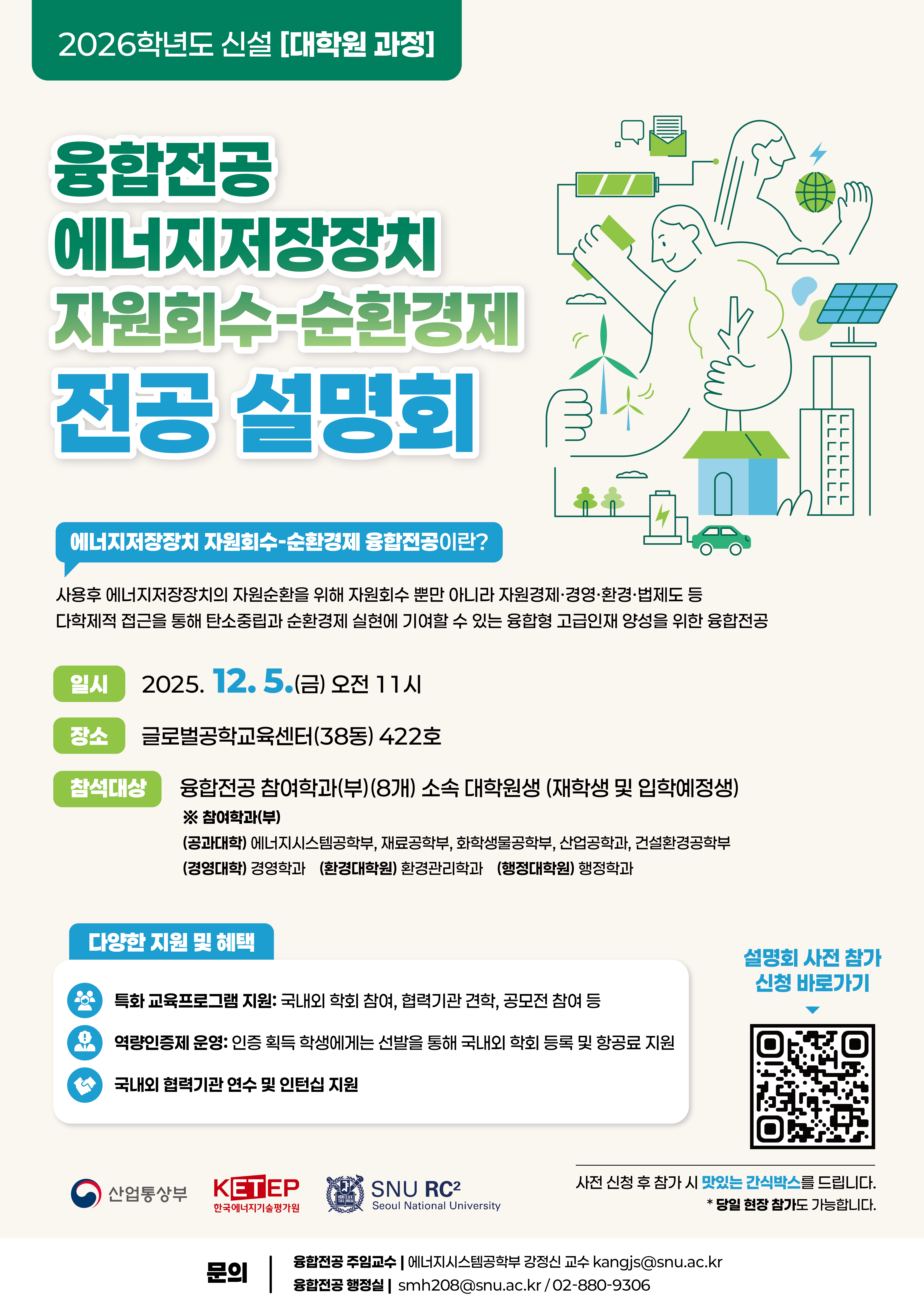 본 연구소 강정신 교수가 수행 중인 산업통상부 에너지인력양성사업 「에너지저장장치의 자원회수-순환경제 융합대학원」의 일환으로 2026학년도부터 신설되는 "융합전공 에너지저장장치의 자원회수-순환경제" 전공설명회를 아래와 같이 개최하오니 관심 있는 대학원생은 참고하시기 바랍니다. 1. 일 시: 2025. 12. 5.(금) 11:00 ~ 12:00 2. 장 소: 서울대학교 글로벌공학교육센터(38동) 422호 강의실 3. 참석대상: 융합전공 참여학과(부) 소속 대학원생(재학생 및 입학예정자) ※ 참여학과(부): (공과대학) 에너지시스템공학부, 재료공학부, 화학생물공학부, 산업공학과, 건설환경공학부 / (경영대학) 경영학과 / (환경대학원) 환경관리학과 / (행정대학원) 행정학과 4. 주요내용: 융합전공 교과과정 및 이수체계, 특화 교육과정 및 학생 지원 제도 안내 등 5. 문 의: 융합전공 행정실(☎02-880-9306, E-mail.smh208@snu.ac.kr) 6. 기 타: 게시대용 포스터 인쇄본은 문서수발실 배부 또는 사송 예정 붙임 융합전공 에너지저장장치 자원회수-순환경제 전공설명회 포스터 1부. 끝