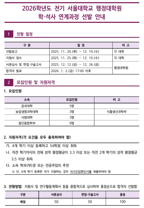 [학부] [입시] 2026학년도 전기 공과대학과 행정대학원 간 학사·석사 연계과정 선발계획 안내
