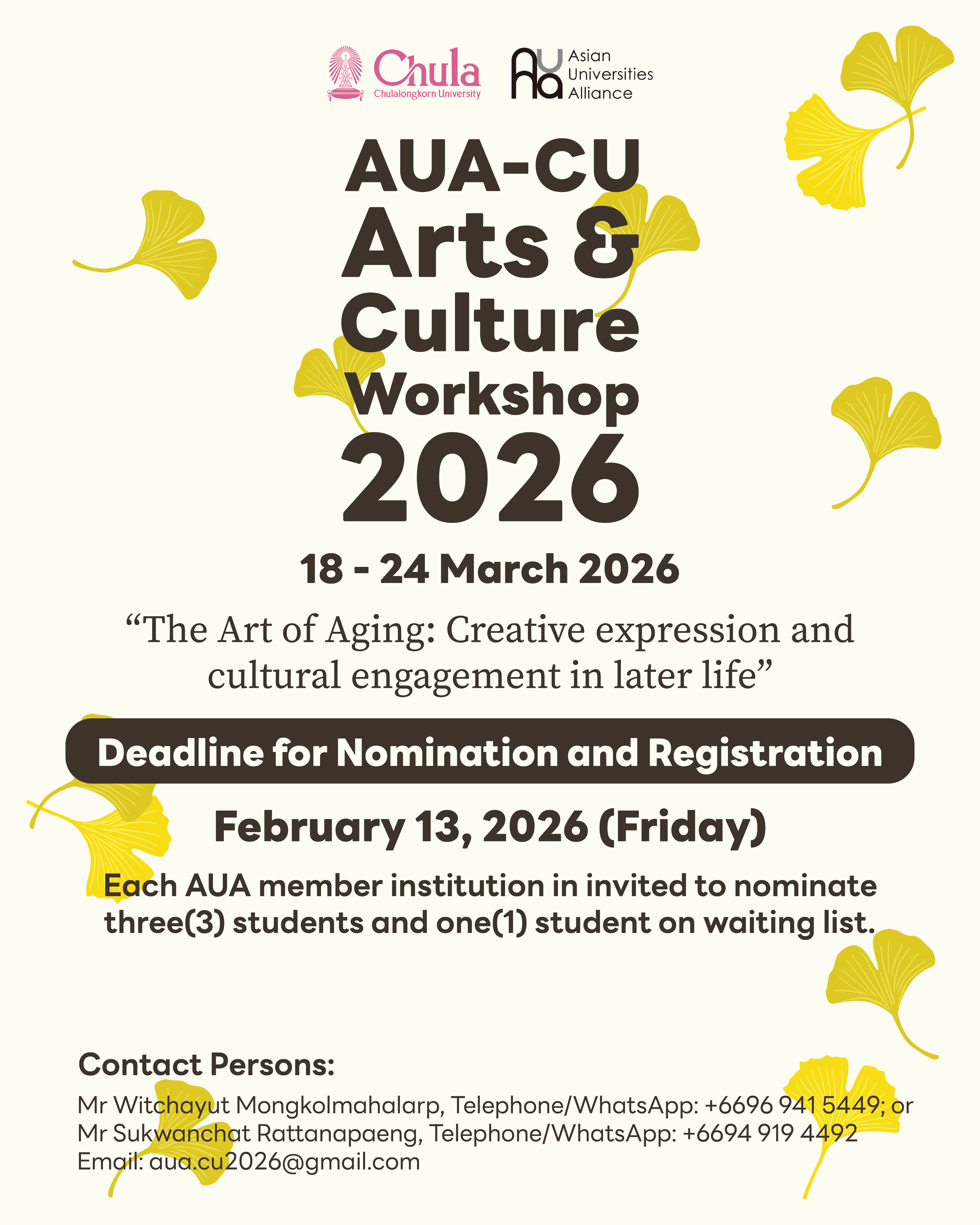 아시아 대학연맹(AUA)과 태국 출라롱콘대학에서 진행하는 ⌜AUA-CU Arts&Culture Workshop Camp 2026⌟ 참가자를 아래와 같이 선발하오니 관심 있는 학생은 지원바랍니다.