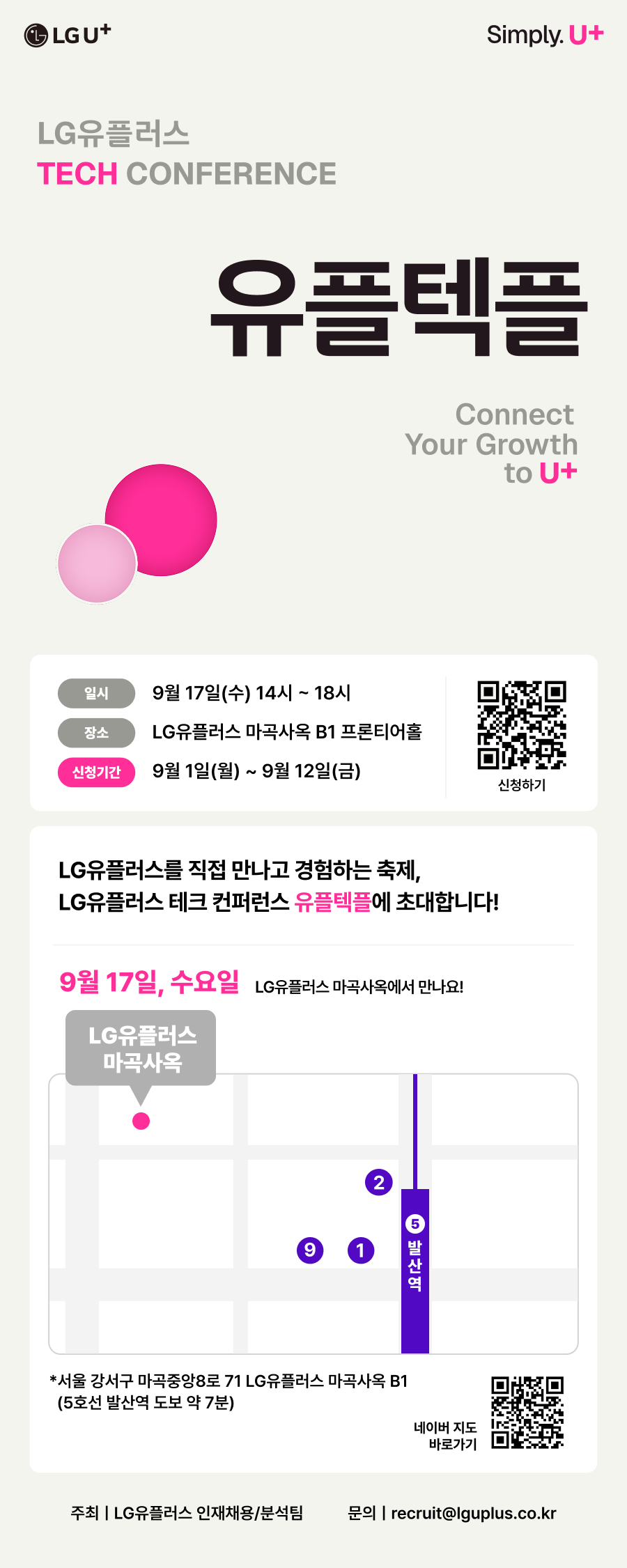 [LG유플러스]9.17(수) TECH CONFERENCE <유플텍플> *현직자 강연 및 직무 상담 네트워킹, 경품 증정 등 유플텍플은 LG유플러스가 다양한 기술력으로 일상을 풍요롭게 만들기 위해 고민하고 도전하는 여정을 소개하는 자리입니다. 유플텍플에서는 기술 개발을 담당하고 있는 연구/전문위원 및 실무자가 직접 기술 현황에 대해 소개하는 Tech Session과 현직 개발자와 직접 소통할 수 있는 Networking Session, 그리고 AI 기술을 직접 체험해볼 수 있는 기술 전시 및 Poster Session 등이 예정되어 있습니다. LG유플러스를 직접 만나고 경험하는 2025 LG유플러스 '유플텍플'에 여러분을 초대합니다! ▶ 바로 신청하기 : https://litt.ly/lguplus_techplus ■ 신청 기간: ~2025.09.12(금) ■ 행사 장소: LG유플러스 마곡사옥 B1 프론티어홀 ■ 행사 일시: 2025.09.17(수) 14:00~18:00