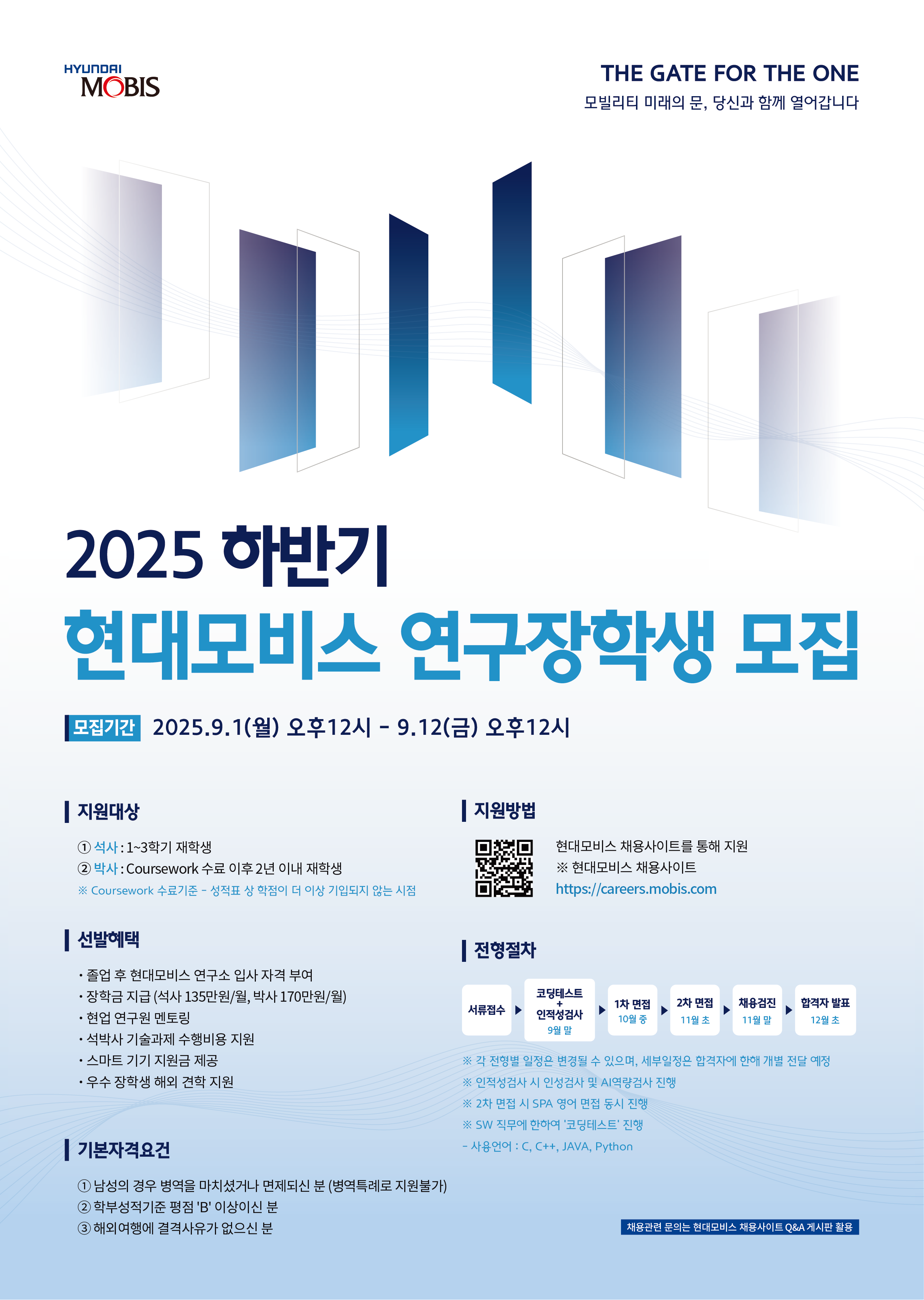 [현대모비스] 25년 하반기 연구장학생 선발 (~9/12(금) 12:00) 현대모비스에서 25년 하반기 연구장학생을 선발하고 있습니다. 현대모비스와 함께 모빌리티의 미래를 두 손으로 직접 열어갈 석/박사 인재 여러분의 많은 관심과 지원 바랍니다. ■ 선발혜택 졸업 후 현대모비스 연구소 입사 자격 부여, 장학금 지급, 현업 연구원 멘토링, 석박사 기술과제 수행비용 지원 등 ■ 모집일정 9월 1일(월) ~ 9월 12일(금) 오후 12시