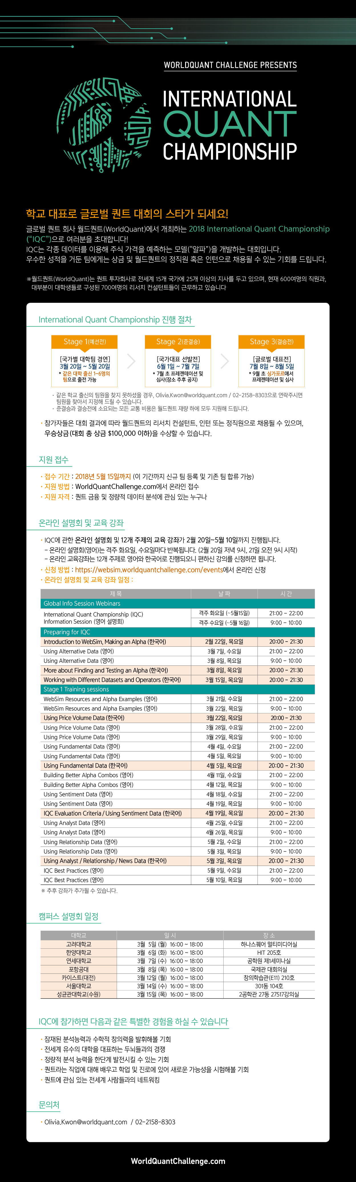 안녕하세요, 글로벌 퀀트 회사 월드퀀트(WorldQuant)에서 개최하는 2018 International Quant Championship (“IQC”)으로 여러분을 초대합니다! IQC는 각종 데이터를 이용해 주식 가격을 예측하는 모델을 개발하는 대회입니다. 우수한 성적을 거둔 팀에게는 특별히 월드퀀트의 정직원 및 인턴으로 채용될 수 있는 기회를 드립니다. 월드퀀트는 퀀트 투자회사로 현재 전세계 15개 국가에 25개 이상의 지사를 두고 있으며, 600여명의 직원과, 대부분이 대학생들로 구성된 700여명의 리서치 컨설턴트들이 근무하고 있습니다. IQC는 다음과 같이 단계별로 진행됩니다: 예선전은 각 나라별로 진행되며, 여러분은 같은 대학 내에서 1~6명으로 이루어진 팀을 자율적으로 구성하여 출전할 수 있습니다. [1] 여러분의 팀이 예선전에서 좋은 성적을 거두면 국가 대표전(준결승)에 출전할 수 있습니다. 준결승에서 선발된 국가대표팀은 올 여름 싱가포르에서 열리는 결승전에 참가할 수 있습니다.[2] 참가자들은 대회 결과에 따라 월드퀀트의 리서치 컨설턴트, 인턴 또는 정직원으로 채용될 수 있으며, 우승상금 (대회 총 상금 $100,000 이하)을 수상할 수 있습니다. IQC에 관한 온라인 설명회와 교육 강좌가 준비되었으니, 일정은WebSim (worldquantchallenge.com)의 Events Calendar에서 확인하실 수 있습니다. 다음 강좌는 2월 20일(화) 저녁 8시에 진행되오니, 신청을 원하시면 https://websim.worldquantchallenge.com/events 를 방문해 주시기 바랍니다. 잠재된 분석능력과 수학적 창의력을 발휘해볼 기회 전세계 유수의 대학을 대표하는 두뇌들과의 경쟁 정량적 분석 능력을 한단계 발전시킬 수 있는 기회 퀀트라는 직업에 대해 배우고 학업 및 진로에 있어 새로운 가능성을 시험해볼 기회 퀀트에 관심 있는 전세계 사람들과의 네트워킹 더 자세한 정보를 얻으려면 http://worldquantchallenge.kr/ 를 방문하시기 바랍니다. 관심있는 학우들에게 이 소식을 전해서 팀을 만드시고, 꼭 대회에서 성공하길 기원합니다! WorldQuant 드림 [1]같은 학교 출신의 팀원을 찾지 못하셨을 경우, Olivia.Kwon@worldquant.com / 02-2158-8303로 연락주시면 맞는 팀원을 찾아서 지정해 드릴 수 있습니다. [2]준결승과 결승전에 소요되는 모든 교통 비용은 월드퀀트 재량하에 모두 지원해 드립니다.