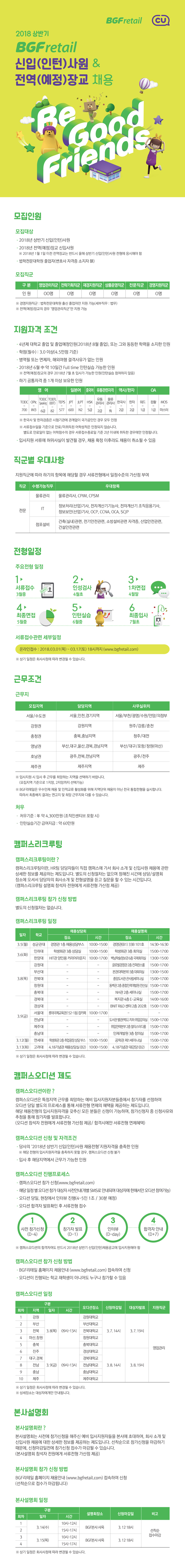 BGF리테일에서 2018년 상반기 신입(인턴)사원을 채용합니다. 채용에 앞서 예비 입사지원자분들을 위해 다음과 같은 행사를 개최하오니, 많은 관심 부탁드립니다. 1. 캠퍼스리크루팅 캠퍼스리크루팅이란 HR팀 담당자들이 직접 캠퍼스에 가서 회사 소개 및 신입사원 채용에 관한 상세한 정보를 제공하는 제도입니다. 별도의 신청절차는 없으며, 아래 홈페이지를 참고하여 일정, 장소를 확인하시기 바랍니다. ☞ 상세내용 보기 : http://www.bgfretail.com/recruit/apply/announceList.do 2. 본사설명회 BGF리테일 회사 소개와 채용에 대한 Q&A 시간을 갖고, 지원자 여러분의 궁금증 해결을 위해 본사설명회를 개최합니다. 사전 참가 신청이 필요하며, 선착순으로 참가 가능합니다. ☞ 상세내용 보기 : http://www.bgfretail.com/recruit/info/seminarInfo.do 기타 자세한 사항은 BGF리테일 홈페이지에서 확인 부탁드립니다.