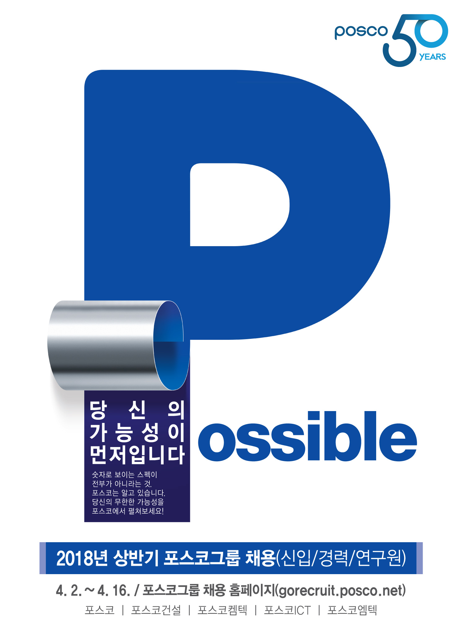 포스코그룹과 미래를 함께할 역량있는 인재를 찾습니다. - 지원기간 : '18.4.2(월) ~ 4.16(월) 14:00 - 지원서 등록 : 포스코 채용 홈페이지에서 등록 - 전형절차 : 서류전형 > 인적성검사 > 1차면접 > 2차면접 > 최종발표 ※ '18년 상반기 포스코 그룹공채 기간에 중복지원 가능하나, 인적성검사는 1개 회사만 응시 가능합니다. <포스코그룹 채용 공고> - 포스코 신입사원 채용 - 포스코 연구원 채용 - 포스코건설 신입사원 채용 - 포스코건설 전역장교 채용 - 포스코켐텍 신입/경력사원 채용 - 포스코ICT 신입사원 채용 - 포스코엠텍 신입사원 채용