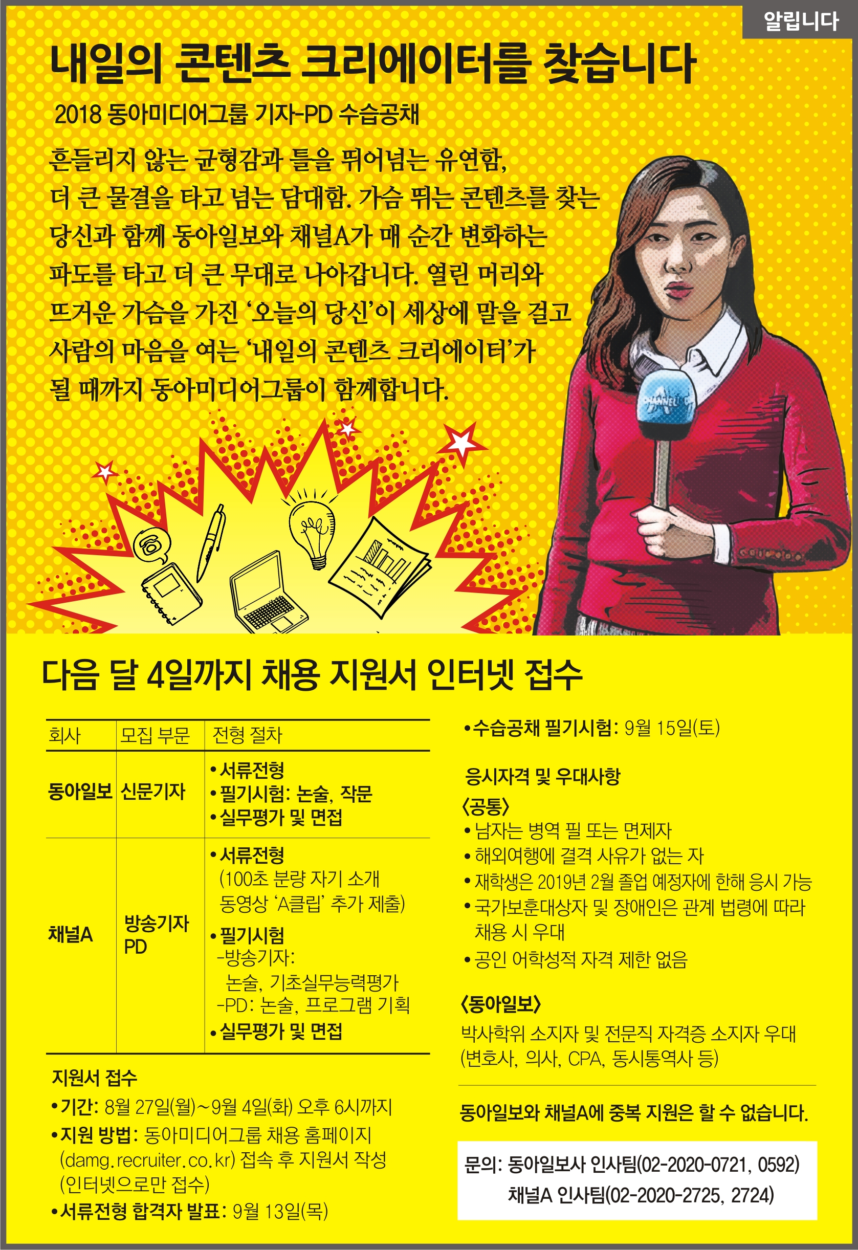 구분 내용 공고명 2018 동아일보 채널A 수습공채(기자, PD) 공고접수기간 2018.08.27~2018.09.04 18시까지 공고 URL https://damg.recruiter.co.kr/appsite/company/index