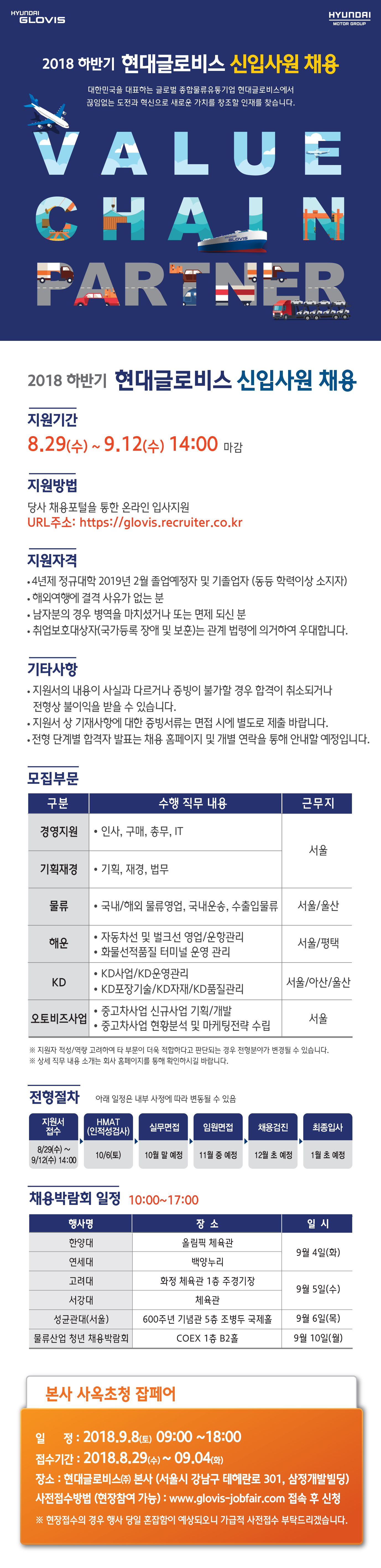 구분 내용 공고명 2018 하반기 현대글로비스 대졸 신입사원 채용 공고접수기간 2018.08.29(수) ~ 2018.09.12(수) 14:00 공고 URL https://glovis.recruiter.co.kr/app/jobnotice/view?systemKindCode=MRS1&jobnoticeSn=17587