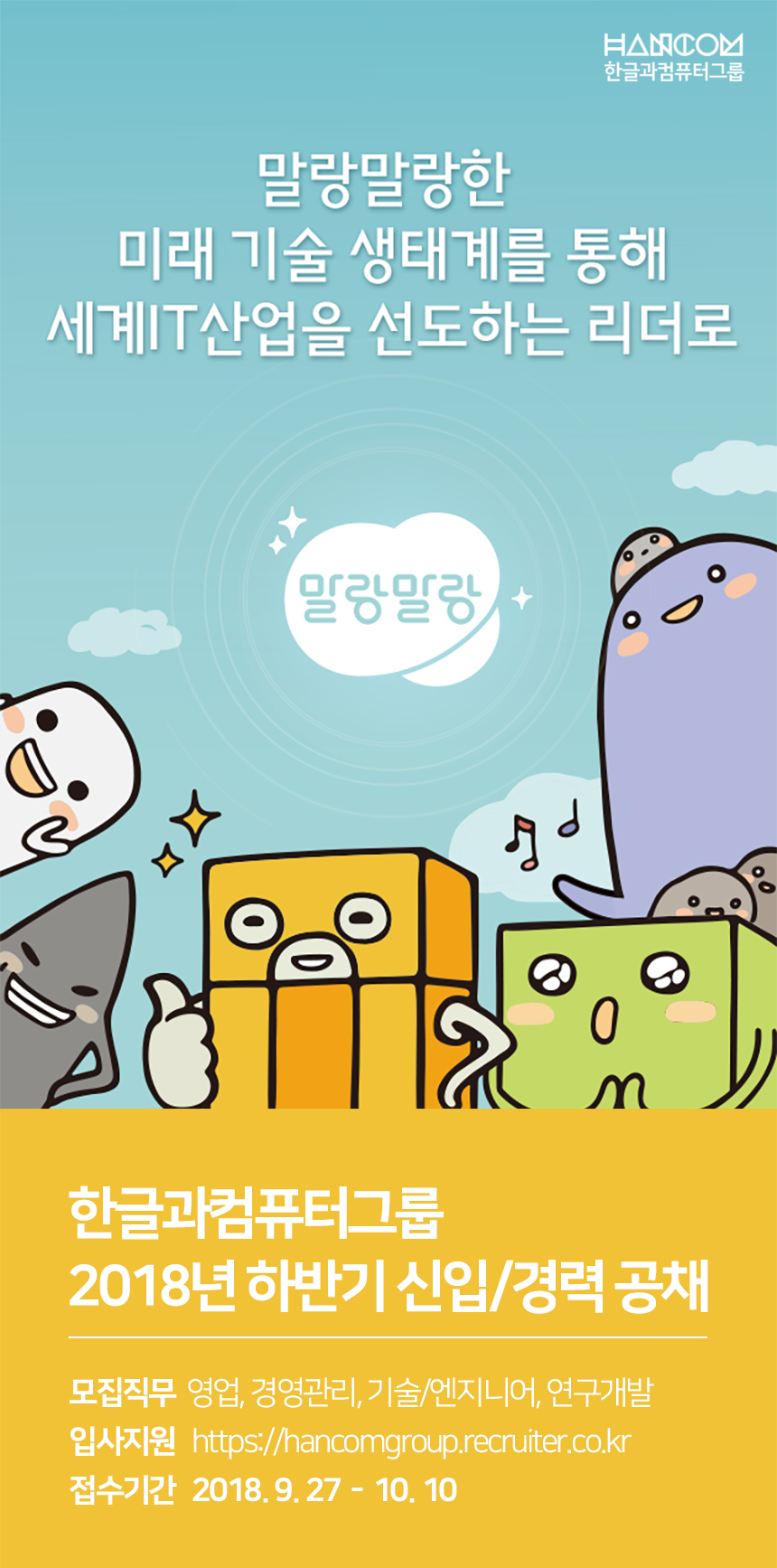 구분 내용 공고명 한글과컴퓨터그룹 2018년 하반기 신입/경력 공채 공고접수기간 2018.09.27 ~ 2018.10.10 공고 URL https://hancomgroup.recruiter.co.kr