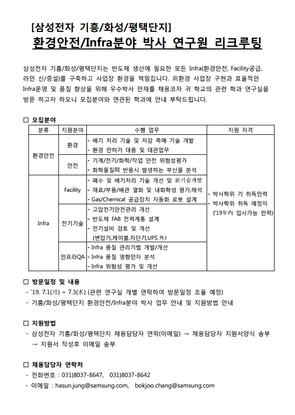 [삼성전자DS] 기흥/화성/평택단지 환경안전/Infra 분야 박사채용 안내