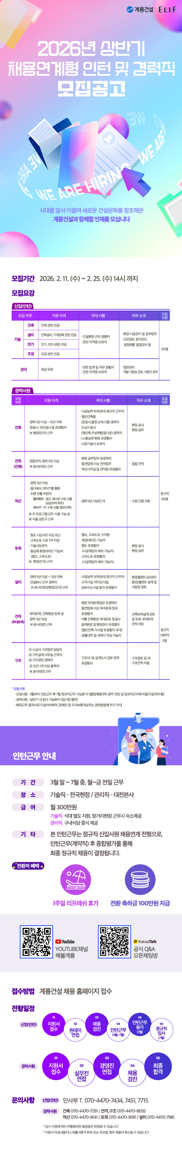 [계룡건설] 2026 상반기 계룡건설 채용연계형 인턴 및 경력직 채용 -모집기간: 26년 2월 11일 ~ 25일 14:00까지 -홈페이지 : https://recruit.krcon.co.kr/hp/krcon/kor/recruit/recruit/ab_hire_list.dev