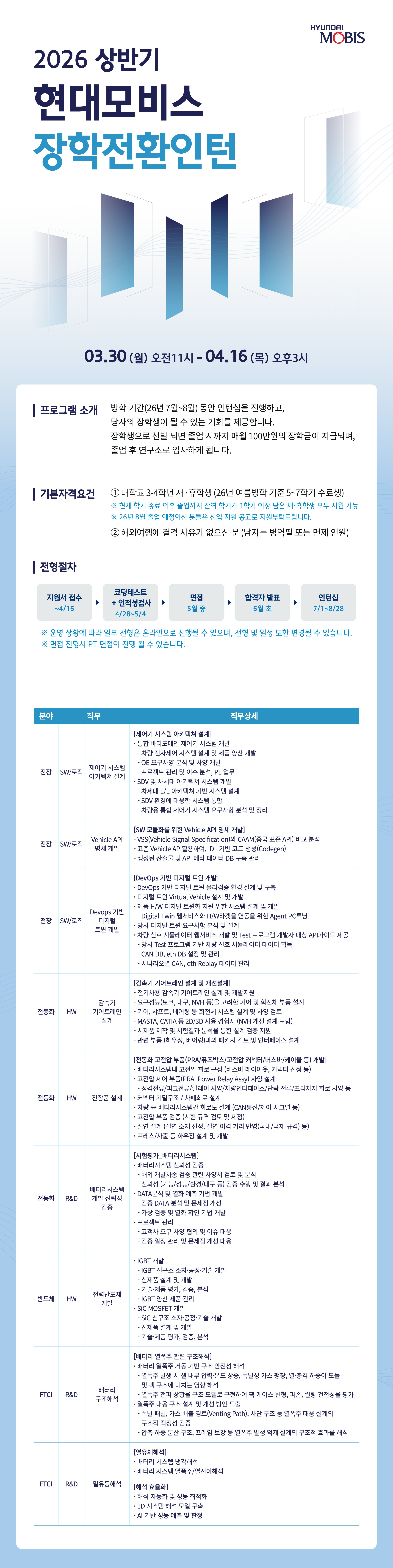 현대모비스에서 26년 상반기 장학전환인턴을 선발하고 있습니다. 현대모비스와 함께 모빌리티의 미래를 두 손으로 직접 열어갈 여러분의 많은 관심과 지원 바랍니다. ■ 프로그램 소개 방학 기간 (26년 7월~8월) 동안 인턴십을 진행하고, 당사의 장학생이 될 수 있는 기회를 제공합니다. 장학생으로 선발 되면 졸업 시까지 매월 100만원의 장학금이 지급되며, 졸업 후 연구소로 입사하게 됩니다. ■ 기본 자격 요건 ① 대학교 3-4학년 재·휴학생 (26년 여름방학 기준 5~7학기 수료생) ※ 현재 학기 종료 이후 졸업까지 잔여 학기가 1학기 이상 남은 재·휴학생 모두 지원 가능 ※ 26년 8월 졸업 예정이신 분들은 신입 지원 공고로 지원부탁드립니다. ② 해외여행에 결격 사유가 없으신 분 (남자는 병역필 또는 면제 인원) ■ 모집일정 3월 30일(월) ~ 4월 16일(목) 오후 3시