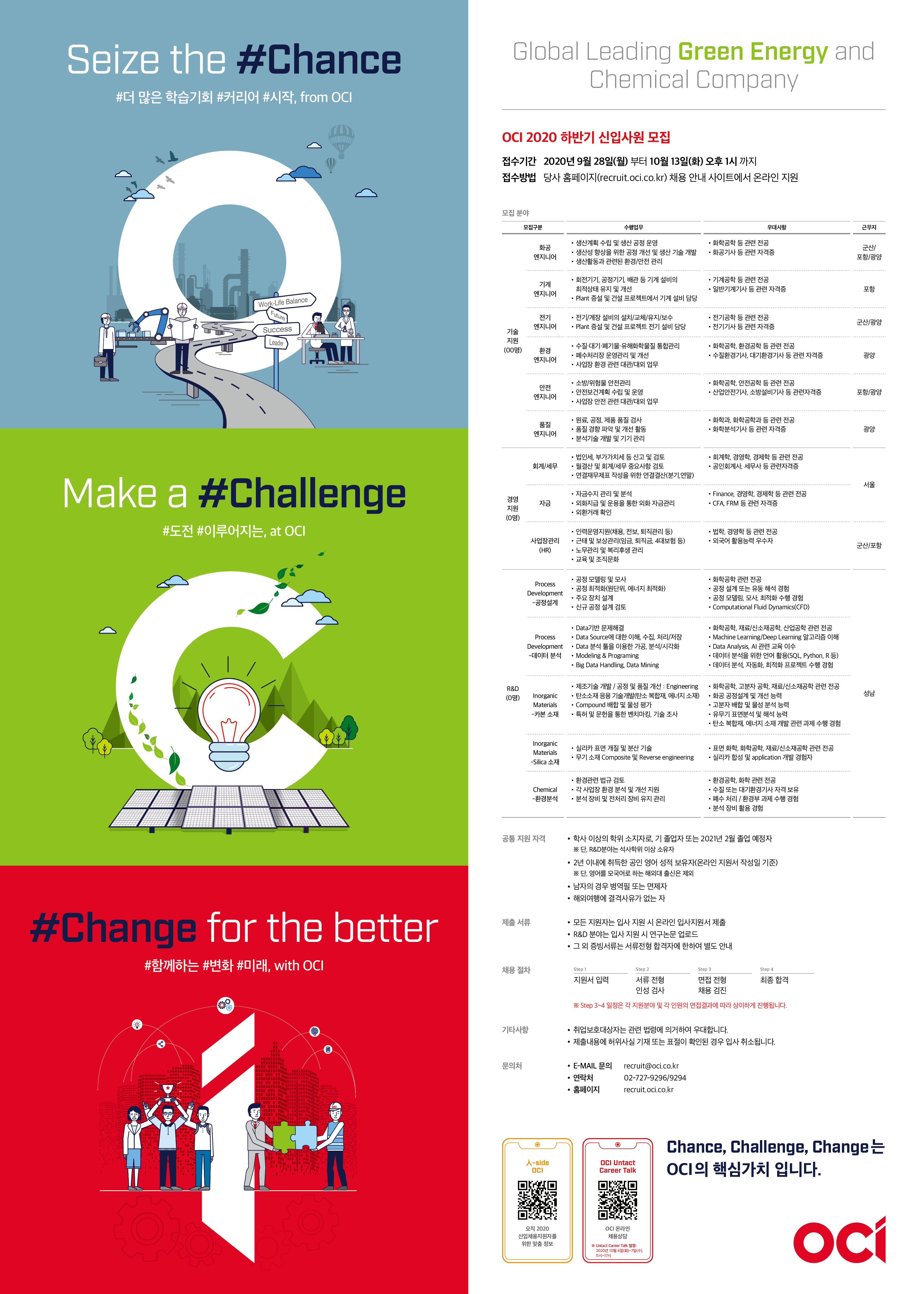 그린에너지 글로벌 기업 OCI에서 2020하반기 신입사원을 모집합니다. OCI는 기초 화학제품부터 태양광 산업, 바이오사업까지 50가지가 넘는 다양한 화학 제품 포트폴리오로 세계 고객에게 솔루션을 제공하는 'Global Leading Green Energy and Chemical Company'를 향해 나아가고 있습니다. •채용 직무별 세부 업무가 궁금하다면! ◼︎ 접수기간 - 2020년 9월 28일 (월) ~ 10월 13일 (화) 오후 1시까지 - recruit.oci.co.kr 온라인 지원 ◼︎ 모집분야 •학사 이상의 학위 소지자로, 기 졸업자 또는 2021년 2월 졸업 예정자 •모든 지원자는 입사 지원 시 온라인 입사지원서 제출 Step 1 지원서 입력 Step 2 서류 전형 / 인성 검사 Step 3 면접 전형 / 채용 검진 Step 4 최종 합격 ※ Step 3~4 일정은 각 지원분야 및 각 인원의 면접결과에 따라 상이하게 진행됩니다. •취업보호대상자는 관련 법령에 의거하여 우대합니다. •E-MAIL 문의 •연락처 •홈페이지