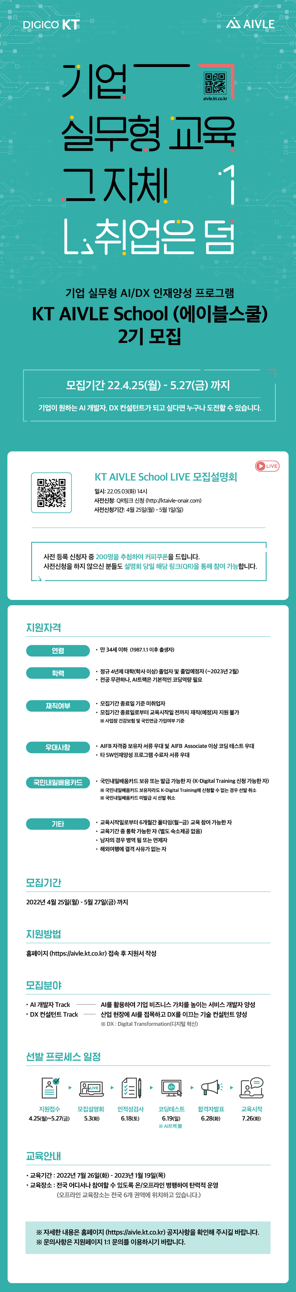 [KT] KT AIVLE School (에이블스쿨) 2기 모집(~05/27(금))