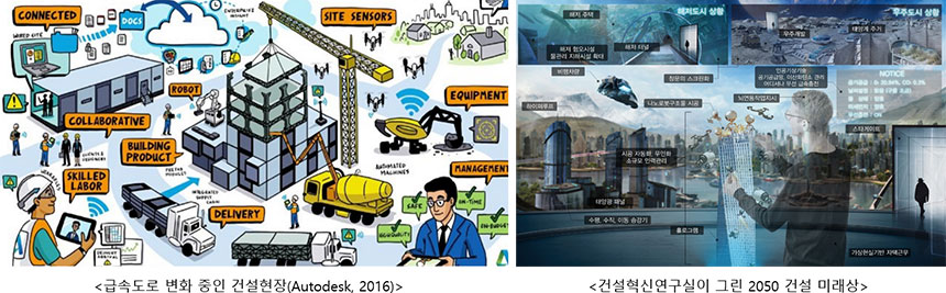 서울대학교 건설혁신연구실은 건설사업 생애주기에 걸친 혁신적인 건설관리를 바탕으로 삶의 본질적인 개념 창조라는 미래의 건설수요에 대응하여 안전하고 친환경적인 최첨단 지역 공동체 건설을 목표로 하고 있습니다. 보다 구체적으로 건설혁신연구실은 발주처, 설계사, 시공사, 협력업체 간의 생애주기에 걸친 소통 및 협업을 바탕으로 한 전통적인 건설관리 연구 외에도 최근에는 다음과 같은 융복합기반 연구개발에 집중하고 있습니다.